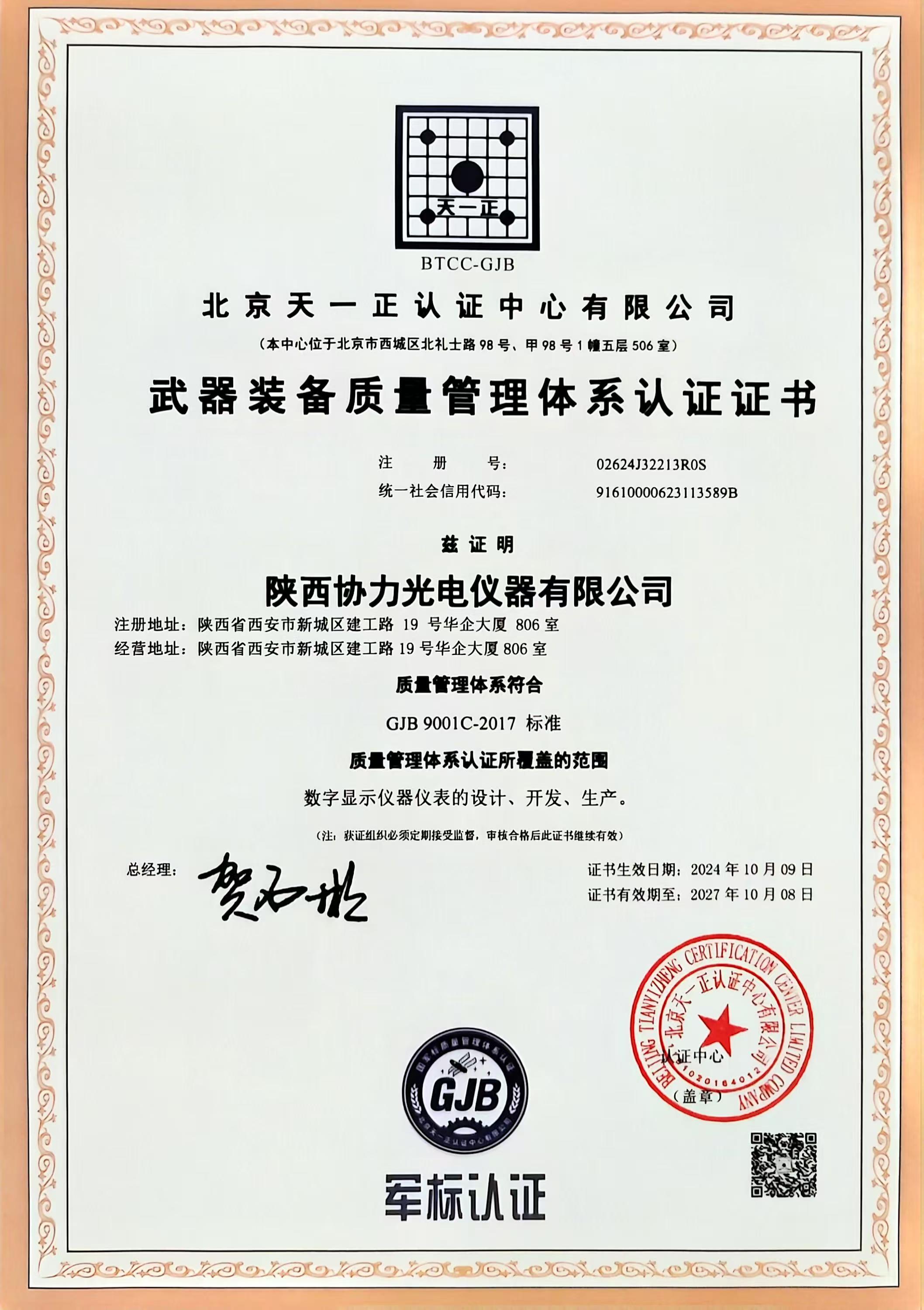 武器裝備質(zhì)量管理體系證書(shū)